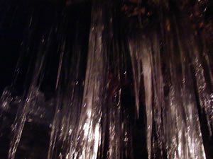 | ◇氷の池 洞内の一番深いところに氷の池がございます。この氷の池ではその昔、氷を切り出して保管し、冷蔵庫がなかった時代には熱病などの対策として医療に用いていました。現在では、四角く切り出した氷を昔のままに再現して展示しています。 注(ここ十数年来地球温暖化が進み、平均気温が上がった為、昔のようには氷はできず、万年氷も徐々に減りはじめています。) |